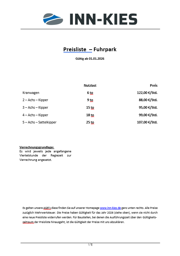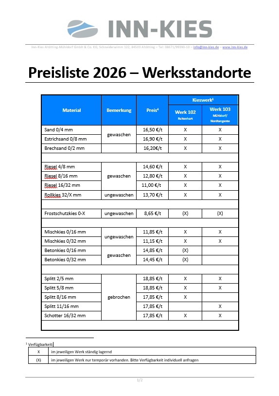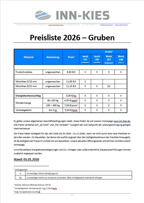 Preisliste unserer Gruben